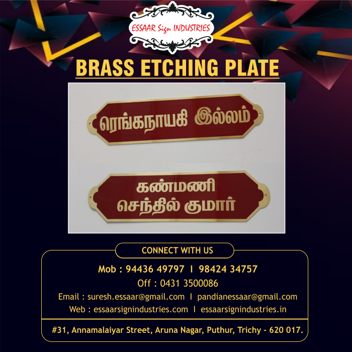Brass Etching Plate🔥 We Made Metal Etching Plate 👏 All Customised Designs available💯 For more details Contact us : 9443649797 , 9842434757 Don't forget to follow our official Instagram & Facebook Pages https://www.instagram.com/essaar_sign_industries https://www.facebook.com/trichyessaarsignindustries #signage #signagedesign #signagemaker #essaarsignindustries #lasercutting #lasertech #etchingplate #brassetching #metaletching #housenameplate #trichy #trending #instagram #facebook